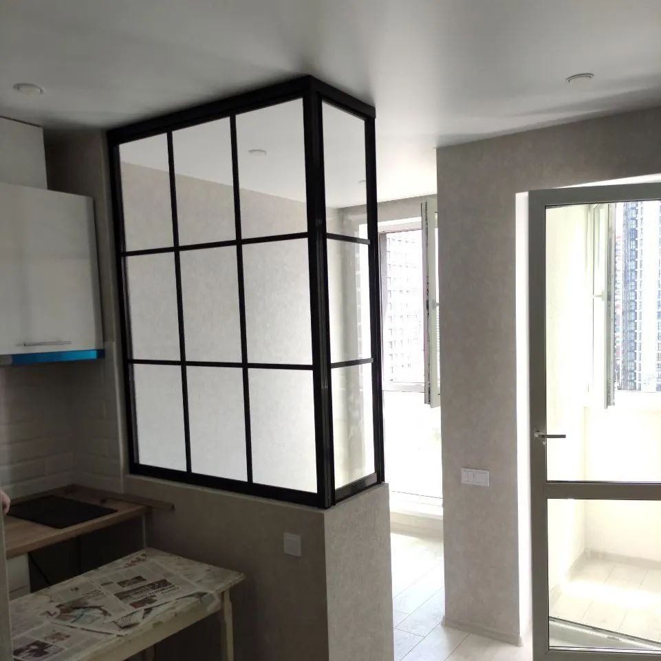 Каскадная перегородка с матовым стеклом, установлена вместо межкомнатных дверей.