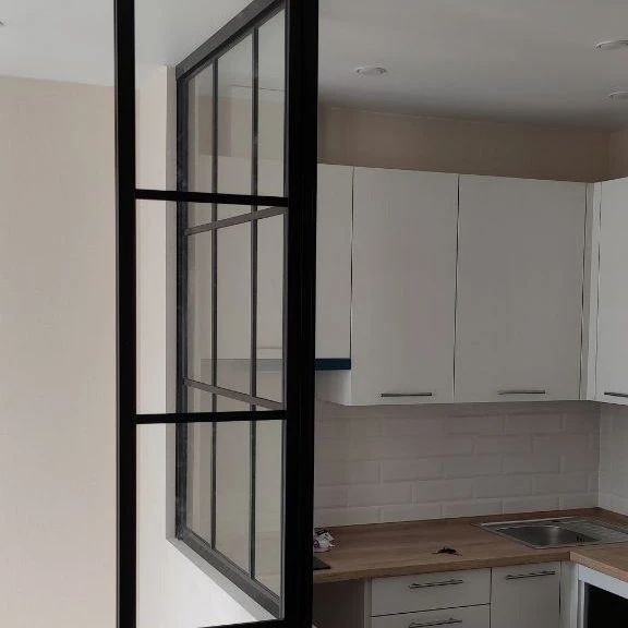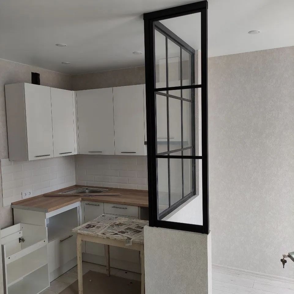 Перегородка в виде окна, угловая Г-образная, установлена между кухней и спальным местом.