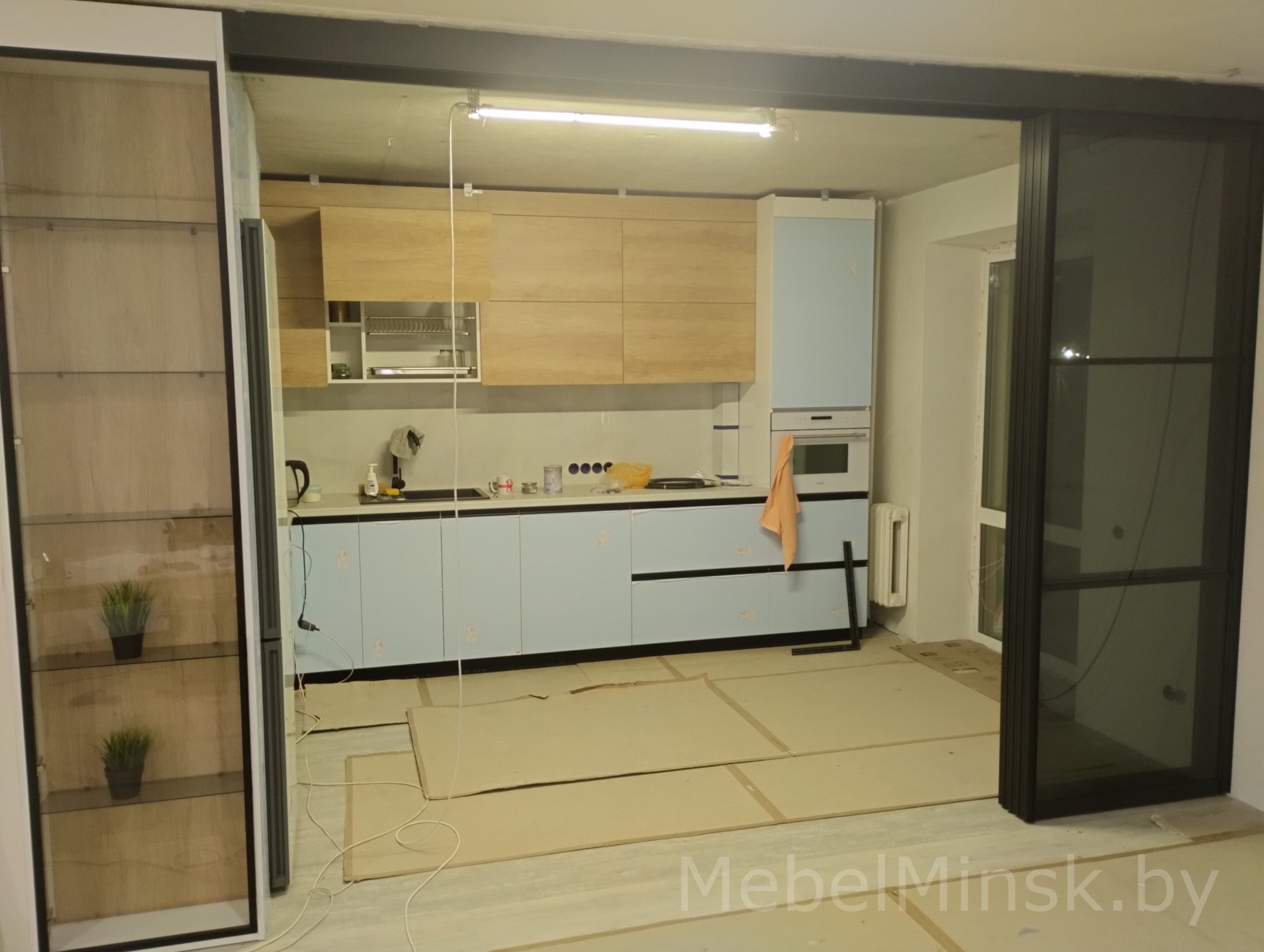 Функциональная перегородка с матовыми фасадами. Шкафчики, открытые полки.