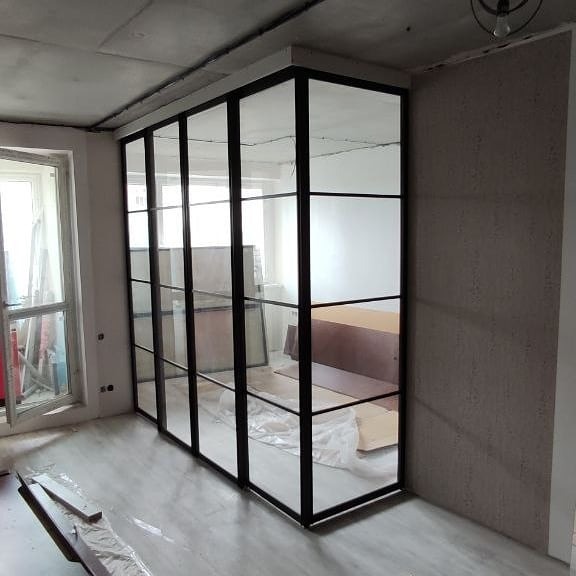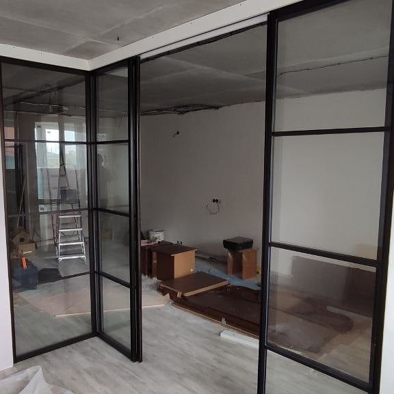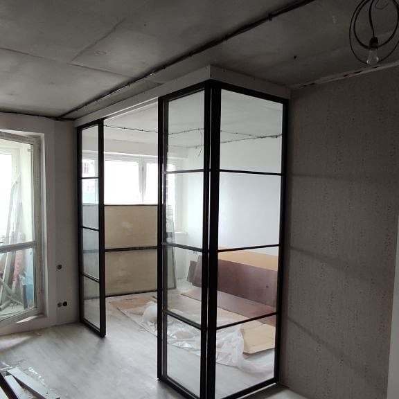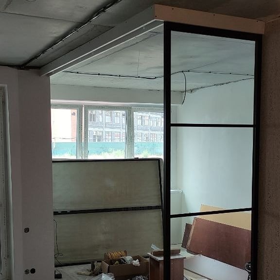 Каскадная перегородка с матовым стеклом, установлена вместо межкомнатных дверей.