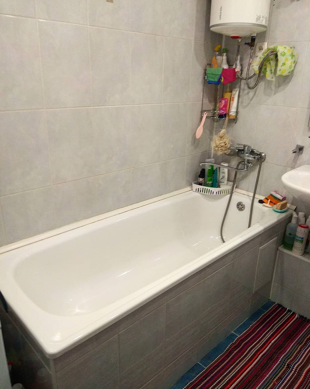 Удобная компоновка - вместились унитаз, раковина с тумбой и душевая кабина.