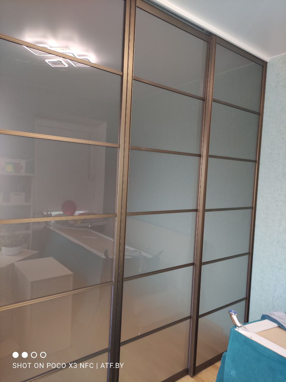 Перегородка с зеркальным эффектом ,перегородка с 1 подвижной секцией, 2 неподвижные.