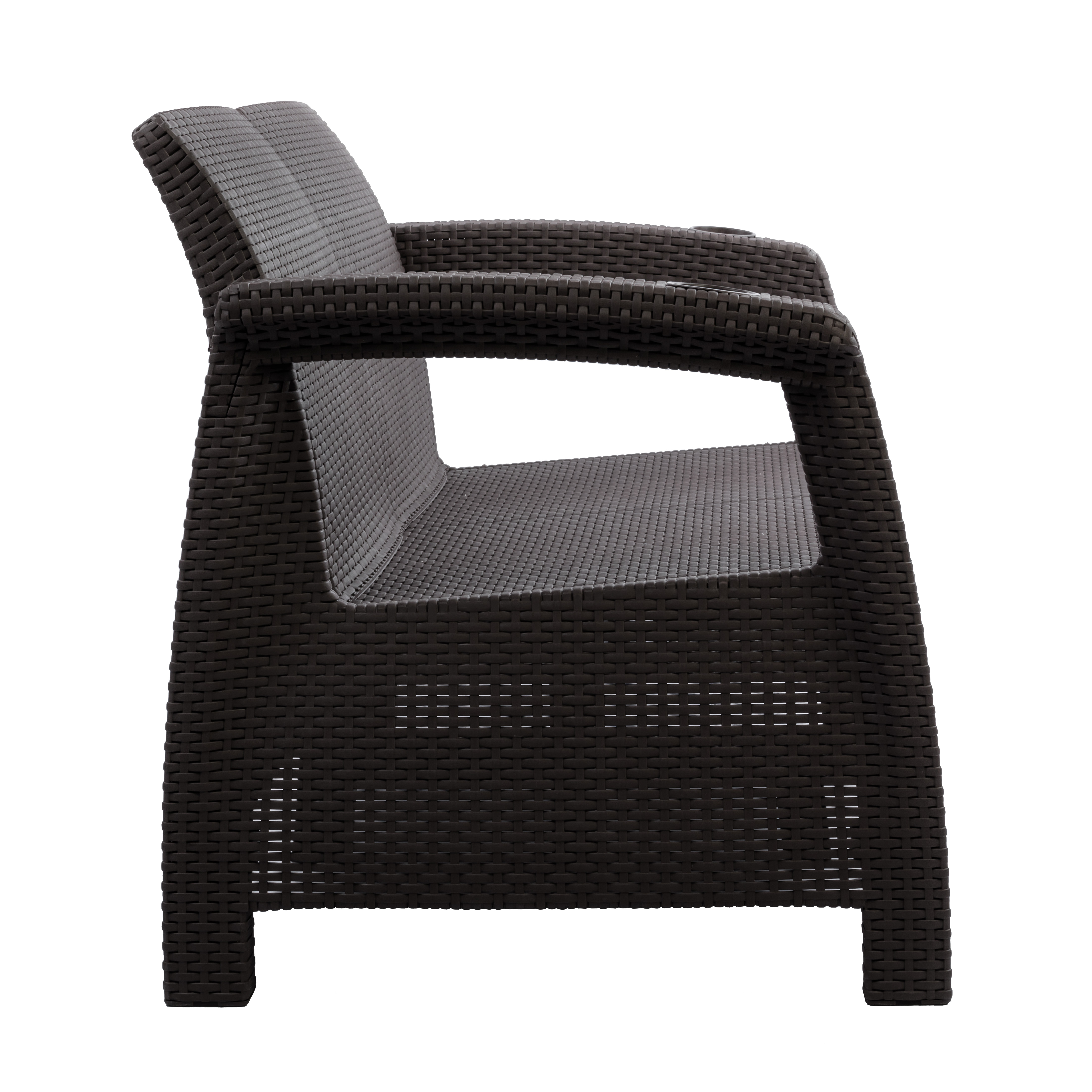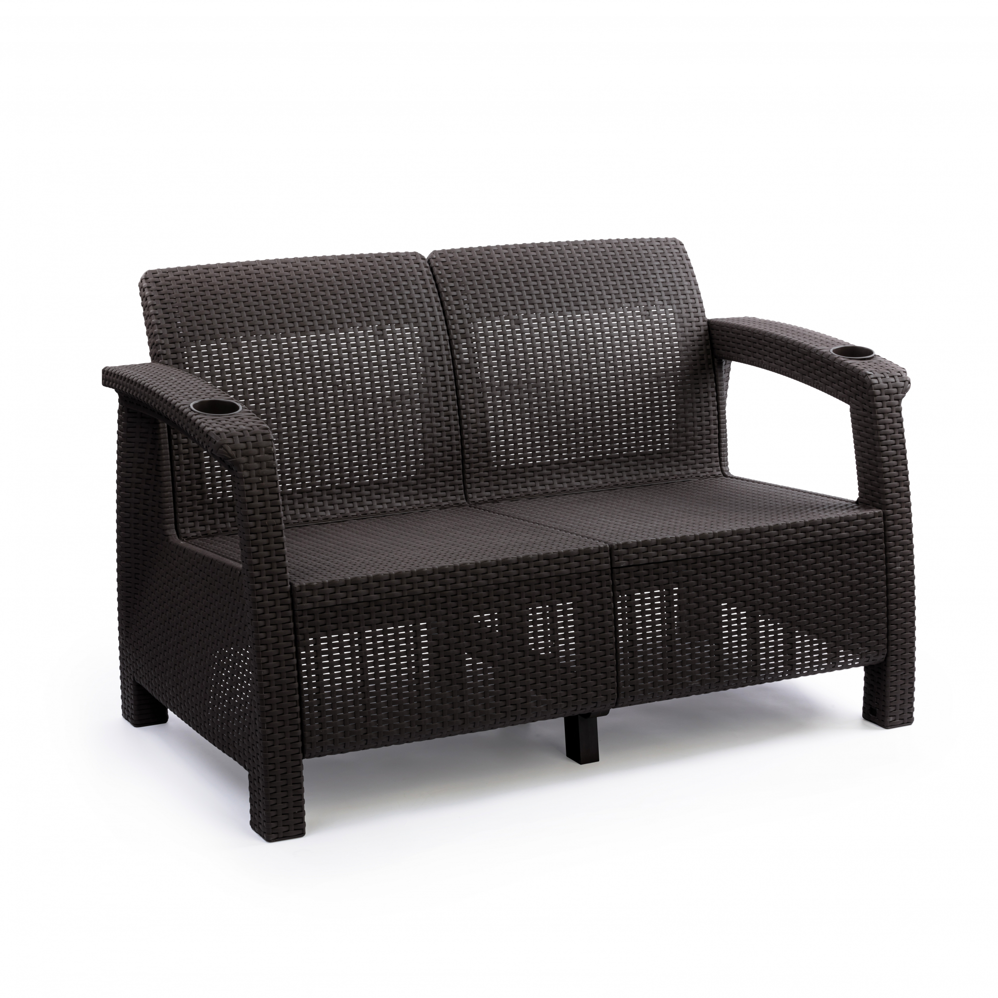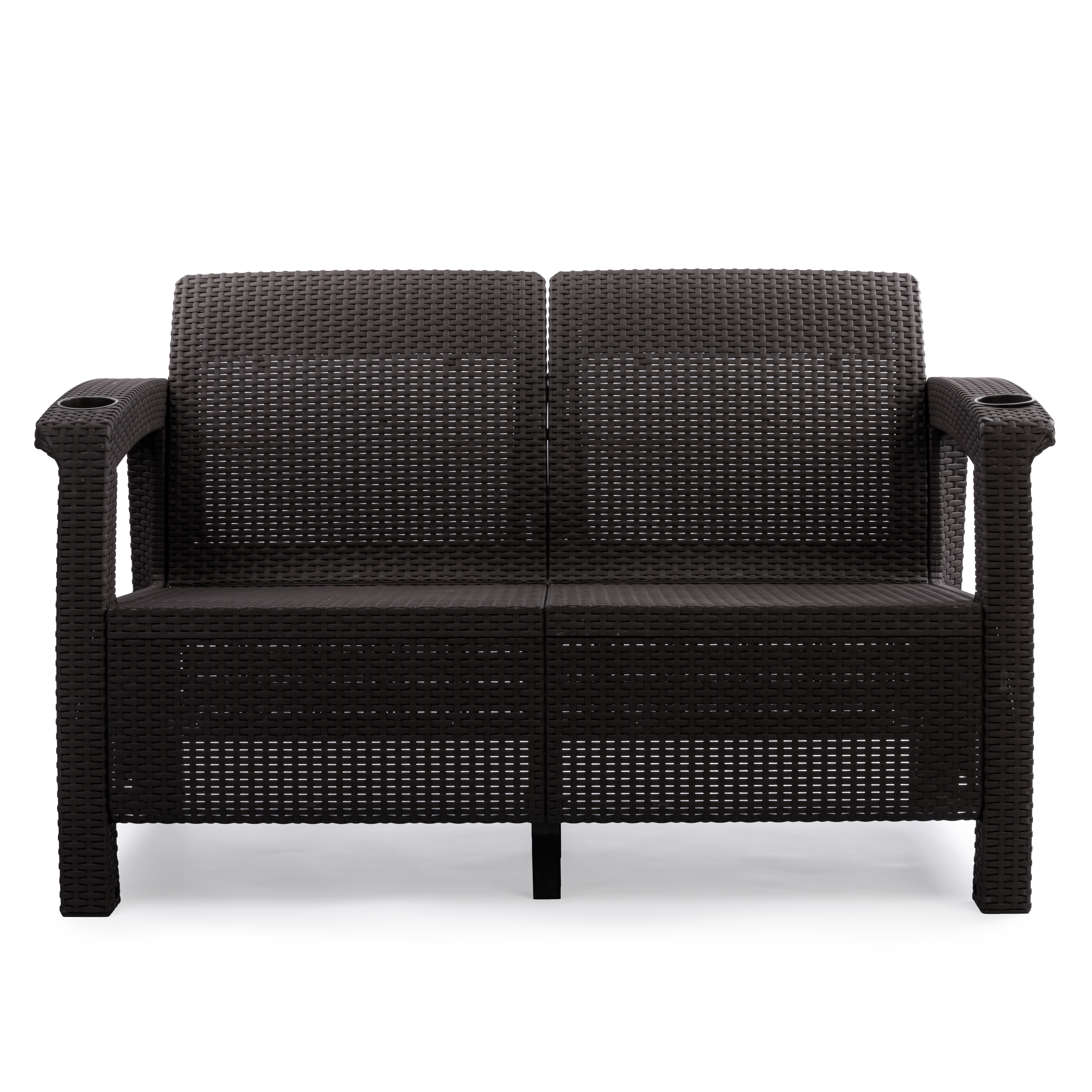 Диван произведен из высококачественного полипропилена, имитирующего плетение из ротанга. Диван имеет два посадочных места, допустимая нагрузка на одно посадочное место - 106 кг (212 кг). На подлокотниках дивана расположены отверстия для напитков. Диван может стать идеальным решением по оформлению зоны отдыха в доме, на садовом участке, в офисном помещении или в кафе. Благодаря цветовым решениям, диван подойдет под любой интерьер. Диван упаковывается в индивидуальную упаковку, инструкция по сборке прилагается. Зону отдыха также можно дополнить журнальным столиком и креслами серии «Ротанг-плюс».