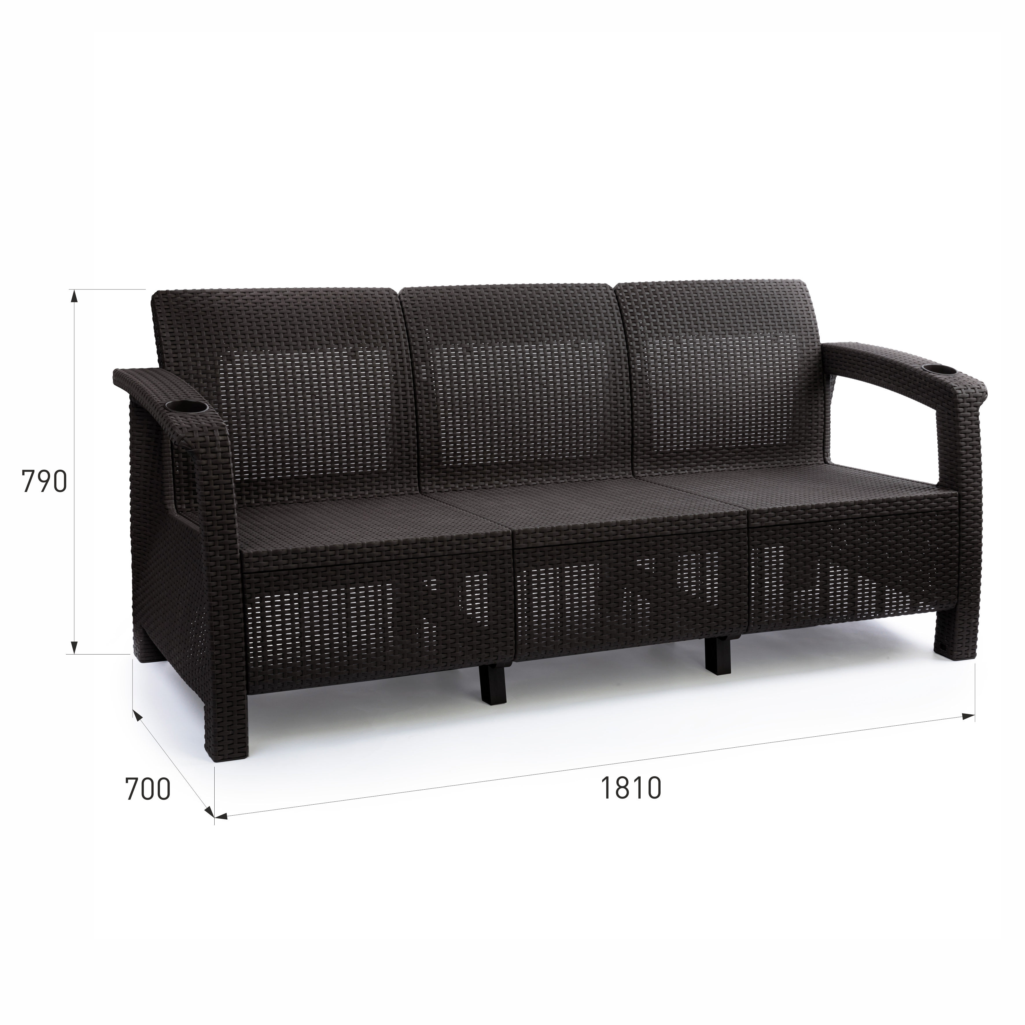 Диван произведен из высококачественного полипропилена, имитирующего плетение из ротанга. Диван имеет три посадочных места, допустимая нагрузка на одно посадочное место - 106 кг (318 кг). На подлокотниках дивана расположены отверстия для напитков. Диван может стать идеальным решением по оформлению зоны отдыха в доме, на садовом участке, в офисном помещении или в кафе. Благодаря цветовым решениям, диван подойдет под любой интерьер. Диван упаковывается в индивидуальную упаковку, инструкция по сборке прилагается. Зону отдыха также можно дополнить журнальным столиком и креслами серии «Ротанг-плюс».