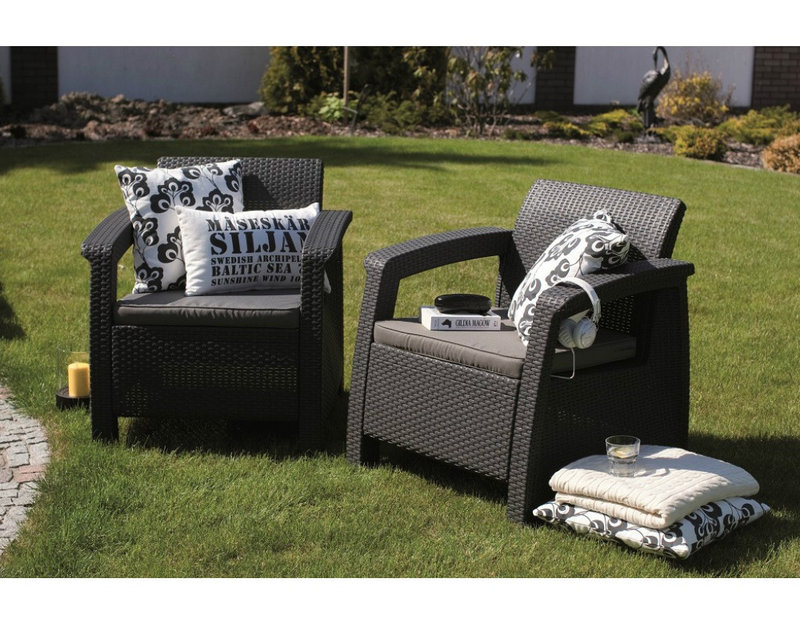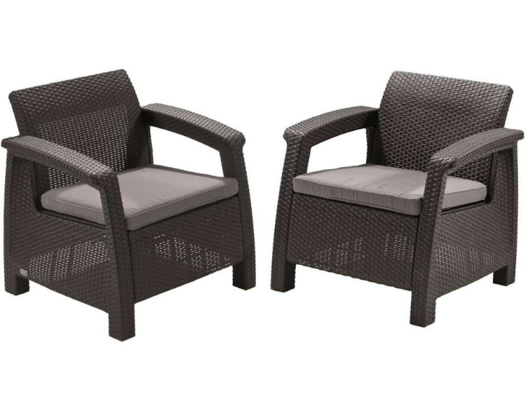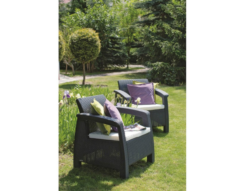 Представленный набор мебели включает два кресла из коллекции «Corfu». Мебель изготовлена из искусственного ротанга и не восприимчива к внешним воздействиям. Прочный каркас обеспечивает долговечность мебели и устойчивость к нагрузкам. Мягкие подушки сиденья не крепятся к кресло и могут быть сняты для стирки.