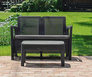 Легкий переносной набор садовой мебели из журнального столика и двухместного дивана. Полиуретан в основе плетения делает набор долговечным, устойчивым в высокой вляжности и воздействию ультрафиолета, за счет чего диван и столик практически не выцветают и неподвержены гниению и увеличению хрупкости, в отличии от обычного пластика.