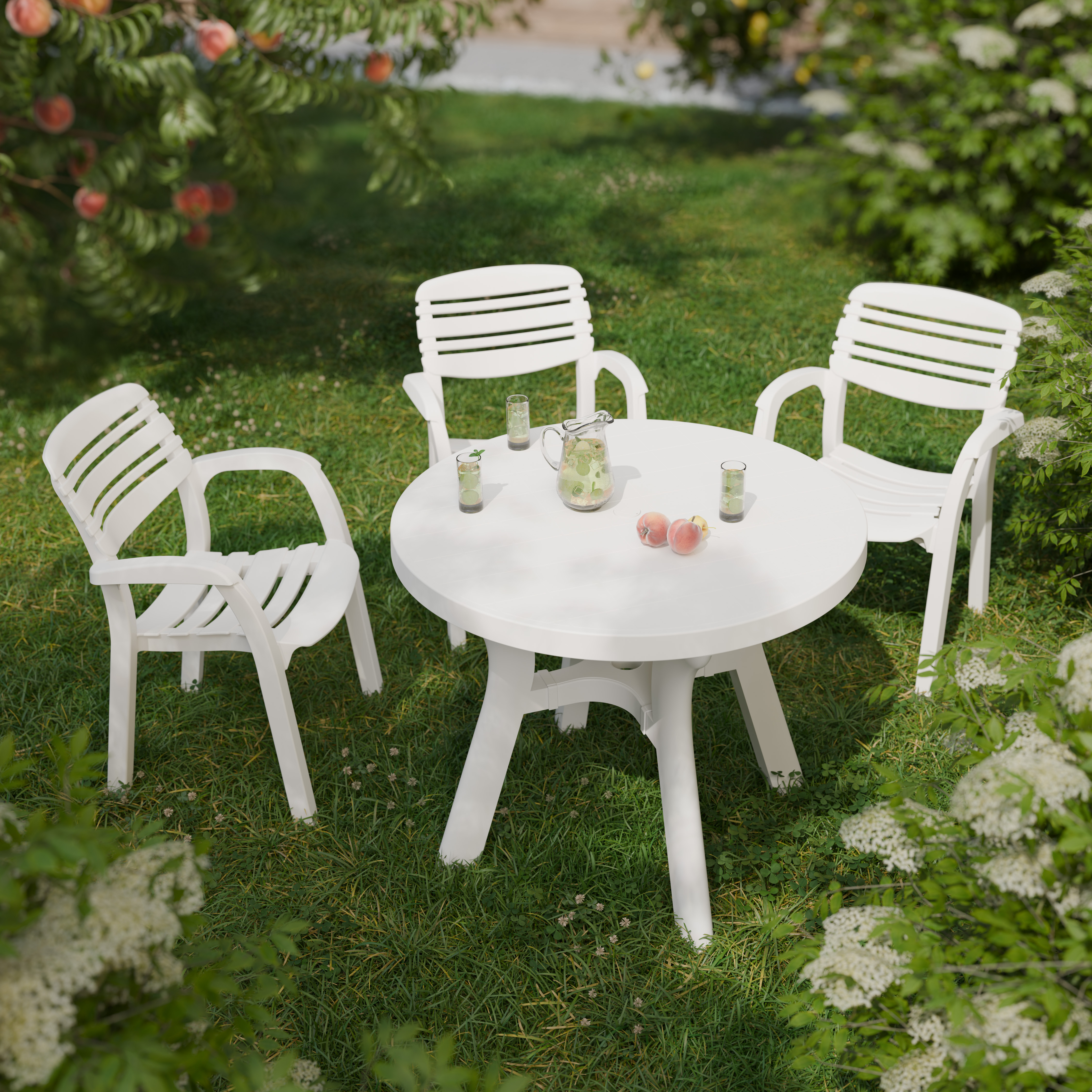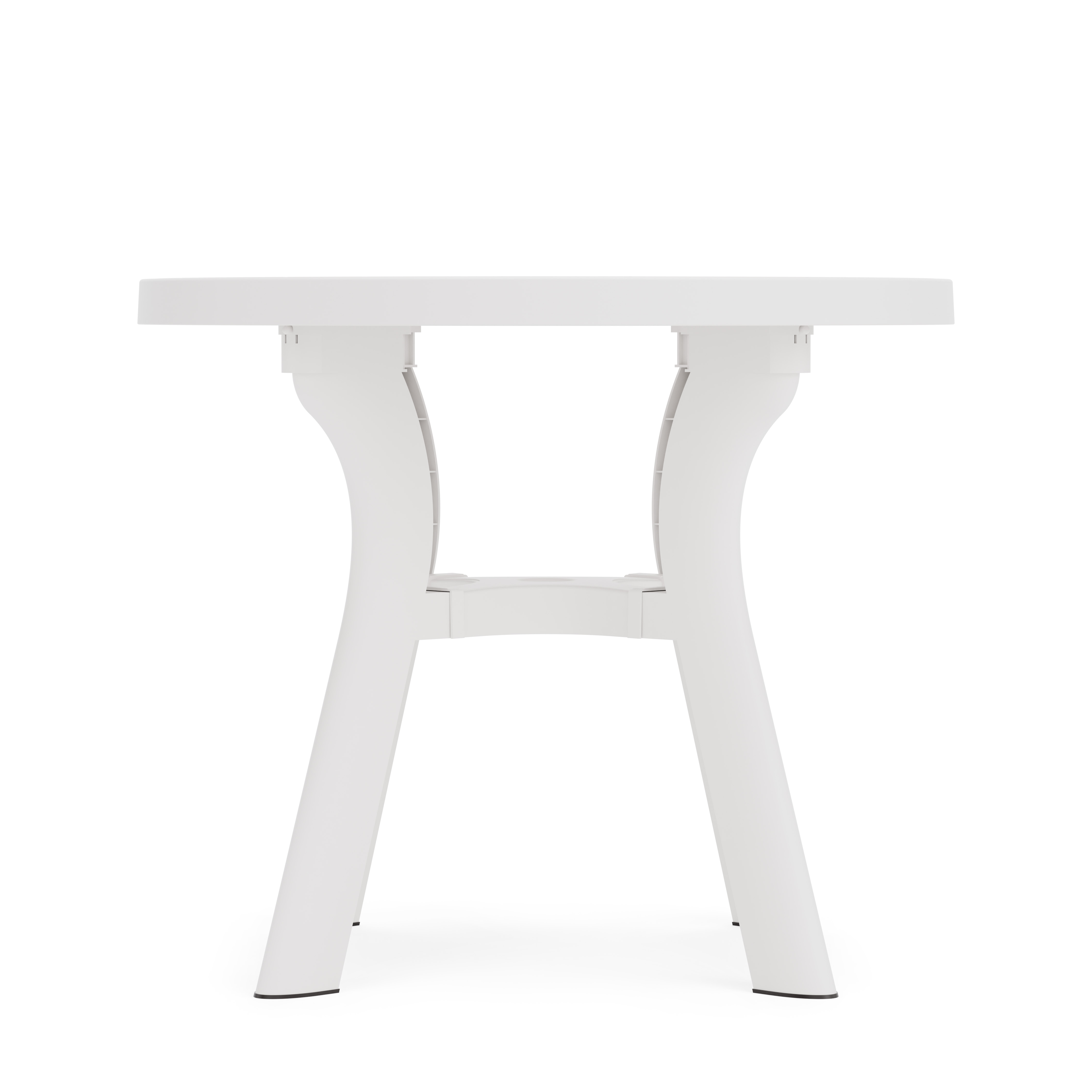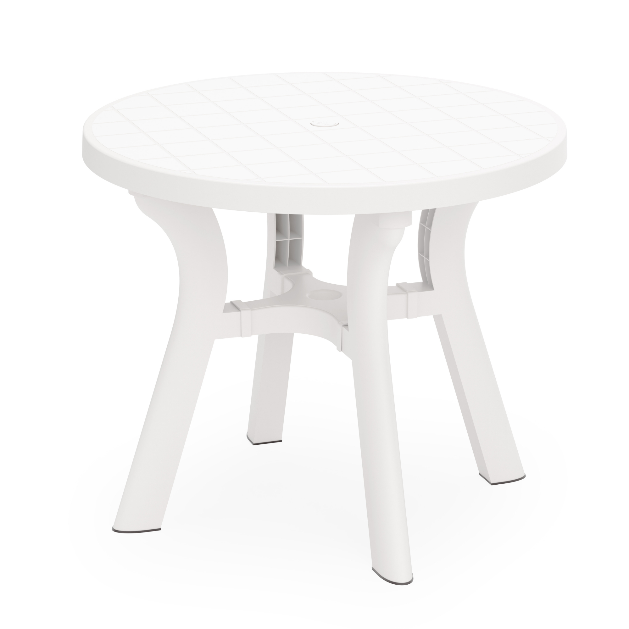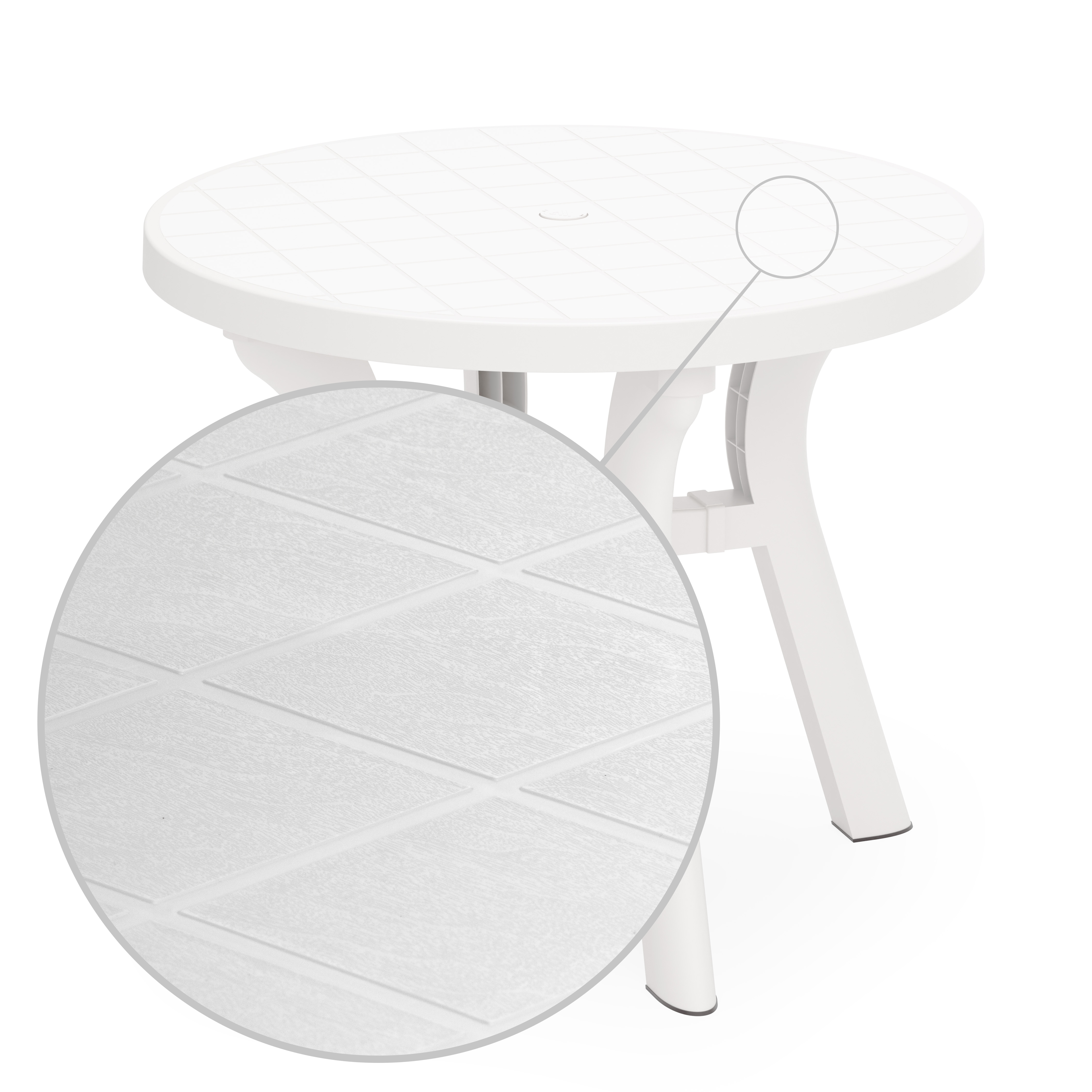 Стол "Атлант" с круглой столешницей имеет прочную конструкцию и устойчивый каркас, выдерживает воздействие внешних факторов, не теряя своего первоначального облика и качества. Изогнутые ножки соединены между собой крестовиной, что придает столу особую устойчивость. Ножки регулируются по высоте. Конструкция полностью разборная, что облегчает транспортировку и складирование. В центре столешницы имеется отверстие с заглушкой для установки зонта. Особенность данного стола в текстуре столешницы, которая эмитирует дерево.