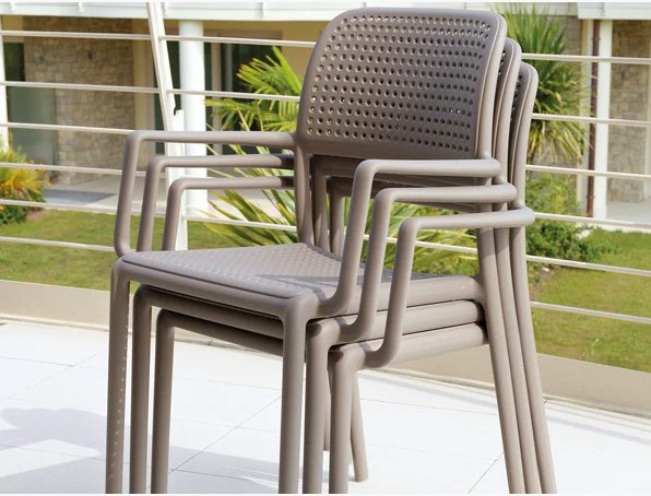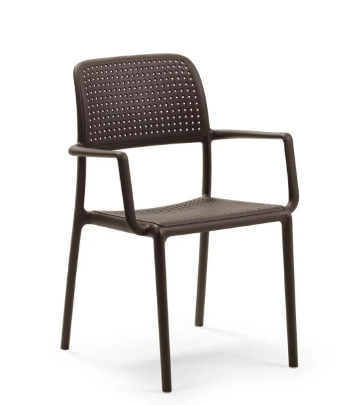 Стильный стул Bora с подлокотниками и перфорированным основанием подойдет как для домашнего использования, например, на террасе или в саду, так и для летних террас кафе и ресторанов.
