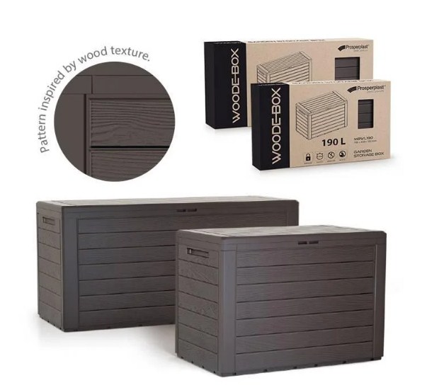 Ящик Prosperplast WOODEBOX очень удобен и практичен для хранения различных предметов и садового инвентаря. С его помощью можно освободить пространство от всевозможных вещей. Идеально подходит для хранения небольшой мебели - складных стульев, а также мягких подушек для кресел или качелей, садового инвентаря и шлангов, игрушек на заднем дворе. Все предметы, спрятанные в нем, будут сухими и в безопасности (возможно запереть на замок).