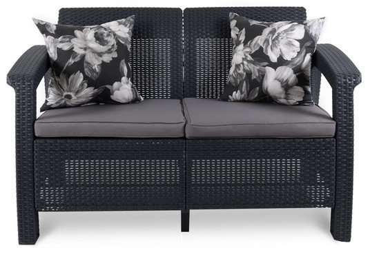Небольшой диван «Corfu Love Seat» выполнен с имитацией плетеного ротанга. Искусственный материал, из которого выполнен гарнитур, устойчив к внешним воздействиям и различным погодным условиям, потому гарнитур можно расположить на открытом воздухе. Мягкий элемент заменяют две небольшие подушки, которые можно стирать в стиральной машине.