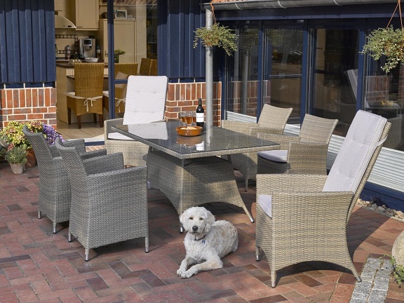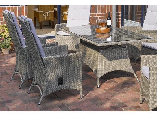 Данный мебельный набор предназначается для установки на приусадебном участке или открытой террасе. В комплект сходит большой обеденый стол со стеклянной столешницей и восемь удобных стульев с мягким сиденьем. Внешняя отделка изделий выполнена с использованием плетения. Алюминиевый каркас стола и стульев придает им высокую прочность и устойчивость, сохраняя при этом небольшую массу.