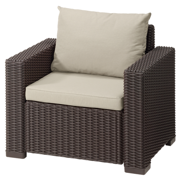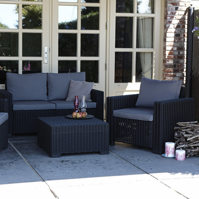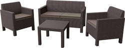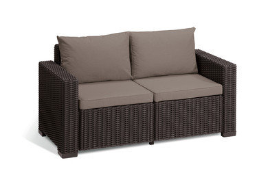 Комплект «KETER CALIFORNIA 2 SEATER» включает в себя двухместный диван, два кресла и журнальный столик. Гарнитур комплектуется декоративными подушками сиденья и спинки, которые можно снять и постирать. Искусственный ротанг легко моется.