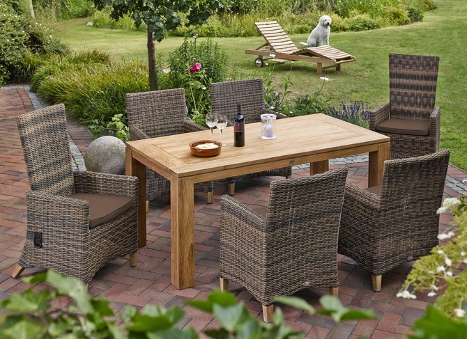 Комплект «Pine» представляет собой изысканный набор мебели ручной работы. Мебель выполнена из искусственного ротанга, обладающего высоким качеством и надежностью. Набор состоит из столика из тика, двух раскладывающих кресел, а также четырех кресел с удобными спинками. Плетеная мебель отличается роскошным бронзово-коричневым цветов и будет прекрасно смотреться на садовом участке или в интерьере кафе.