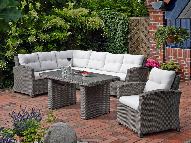 Комплект «Riviera», состоящий из столика и углового дивана, выполнен из металлического каркаса и искусственного ротанга серого цвета. Ротанг — всепогодный материал, который не боится ни солнца, ни дождя. В комплекте с садовой мебелью идут подушки для сидений и спинки, белый цвет которых прекрасно сочетается с плетеной мебелью.