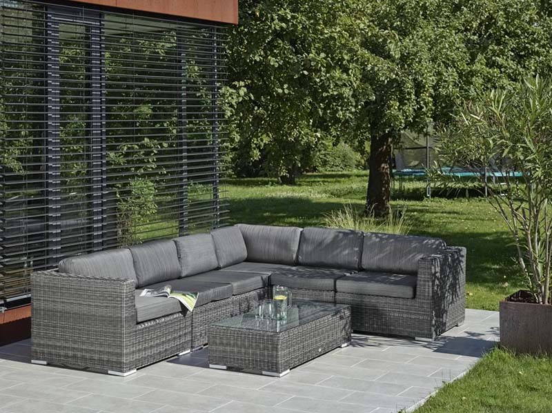 Комплект мебели состоит из кофейного столика со стеклянной столешницей и комфортного дивана с мягкими подушками. Плетеная мебель изготовлена из прочного полиротанга, а каркас выполнен из алюминия. Диван собирается из модулей, что позволяет выбрать нужный размер мебели.