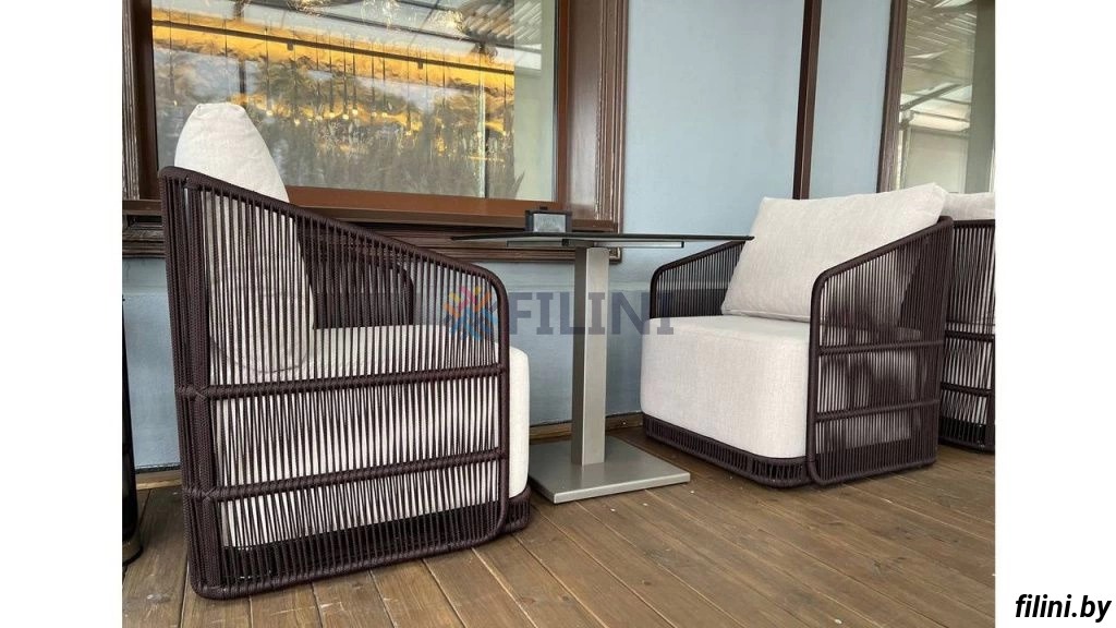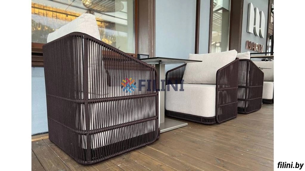 Коллекция "Марбл" - сдержанная, лаконичная и очень надежная уличная мебель из роупа (веревки), плетение которой выполнено в виде множества вертикальных линий, придающих ей грациозность: