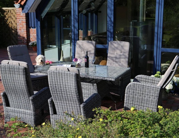 Размер: 90x120x76 см. Каркас: алюминий, в комплекте стекло закаленное 6 мм, плетение ажурное 7-10 мм, штабелируемый.