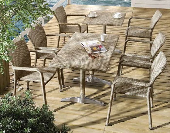 Размер: 90x150x76 см. Каркас: алюминий, в комплекте стекло закаленное 6 мм, плетение ажурное 7-10 мм, штабелируемый.