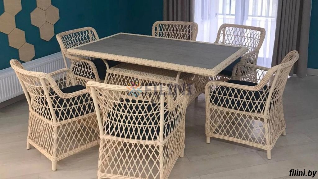 Прочная металлическая конструкция каркасов с нанесенным на них полимерным покрытием, в сочетании с плетением в виде широкого ромба, выполненным из искусственного ротанга, гарантирует отличную устойчивость изделий к воздействию влаги, солнечных лучей и резких перепадов температуры, делая комплект мебели идеальным решением для использования на открытом воздухе.