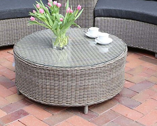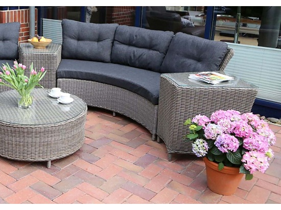 Данный мебельный набор позволяет организовать приятный праздник на свежем воздухе в кругу семьи и друзей. Набор включает в себя небольшой круглый столик и два полукруглых дивана с боковыми подставками. Мебель рекомендуется размещать на крытой террасе или под навесом. Столик и диванные подставки имеют накладную столешницу из прочного стекла. В комплекте идут мягкие подушки.