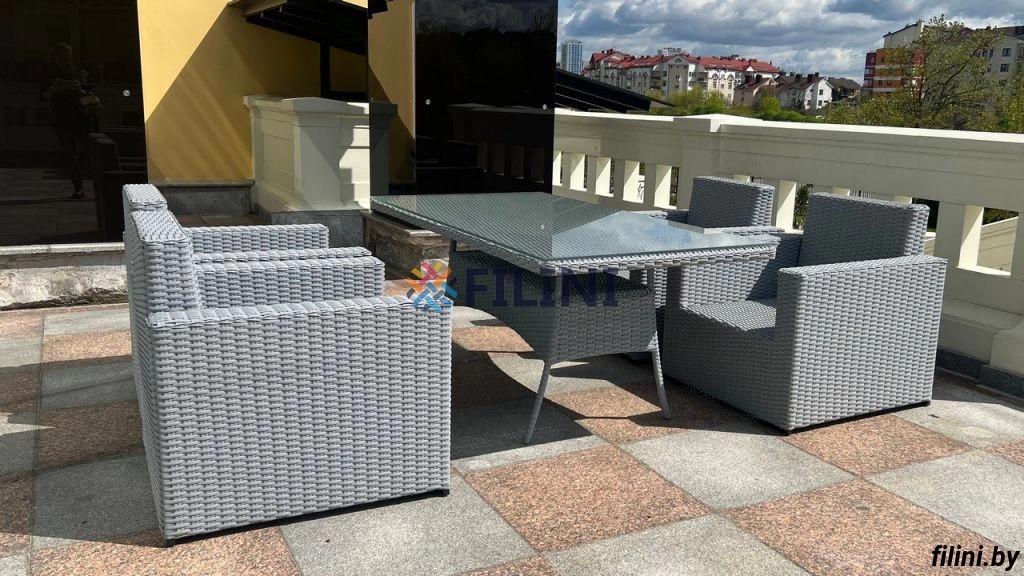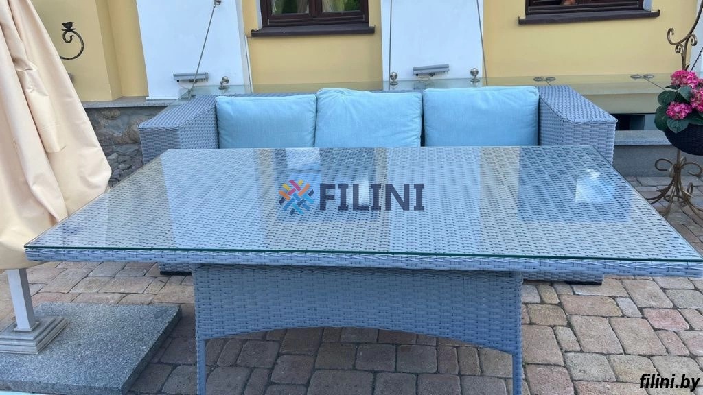 На главном фото изображен садовый стол "Лорен" из искусственного ротанга светло серого цвета (RAL 7040), на 8 посадочных мест, с накладной бесцветной стеклянной столешницей. Размер стола составляет: ширина - 180 см, глубина - 90 см, высота - 74 см.