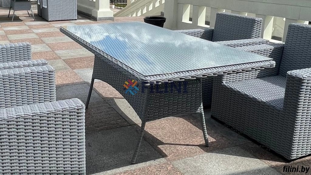 В качестве столешницы используется бесцветное закаленное стекло толщиной 8 мм, укладываемое на рамку подстолья с глухим плетением из искусственного ротанга.