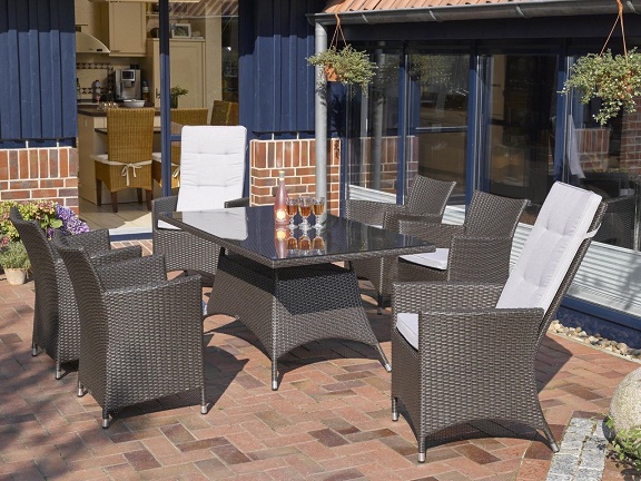 Стол «Carlos» в коричневом цвете - прекрасный вариант для оформления больших террас с зоной барбекю. Стол имеет очень прочный алюминиевый каркас, который образует устойчивую конструкцию, выполненную из ротанга в сером цвете. Модель имеет прямоугольную столешницу с закаленным стеклом, установленную на очень изящную подставку с четырьмя ножками, дополненными хромированными накладками.
