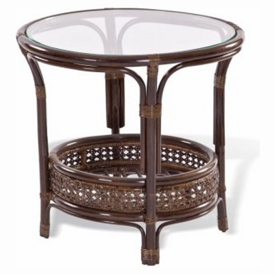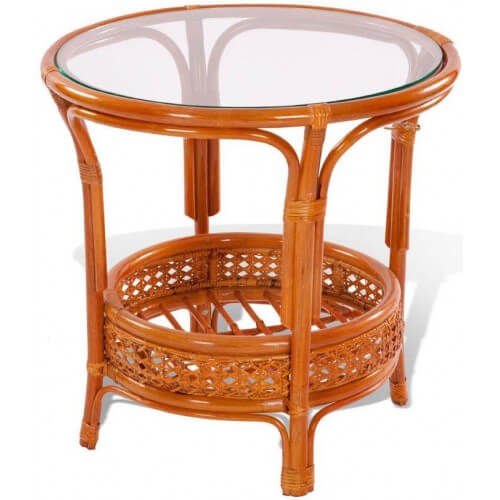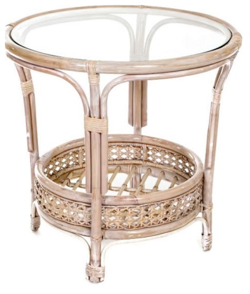 Компактный круглый журнальный столик с прозрачной стеклянной столешницей. Реечное подстолье обрамлено по контуру плетеным материалом.