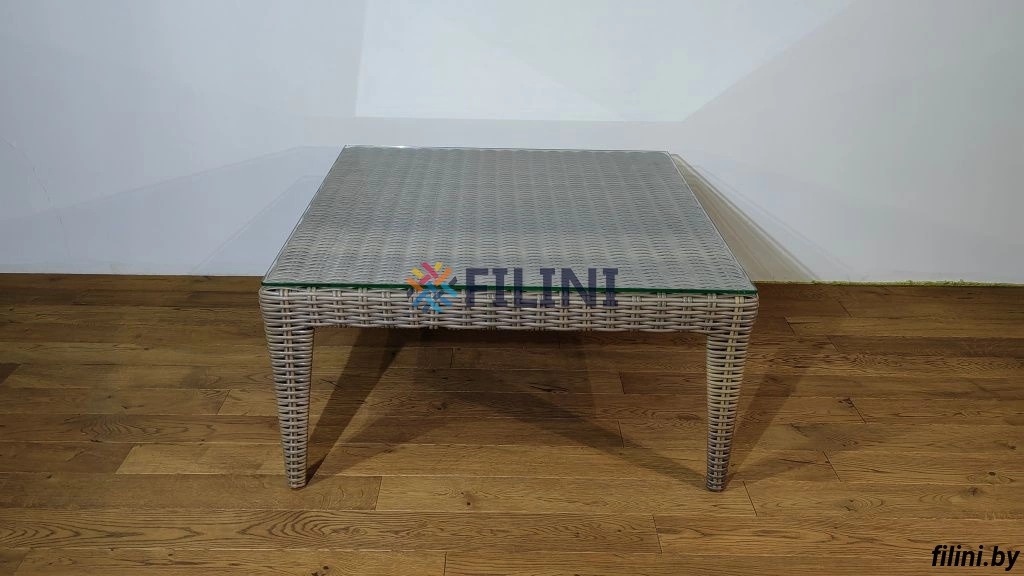 Столешница выполнена из бесцветного закаленного стекла толщиной 8мм укладываемого на "глухое" плетение из полиротанга.