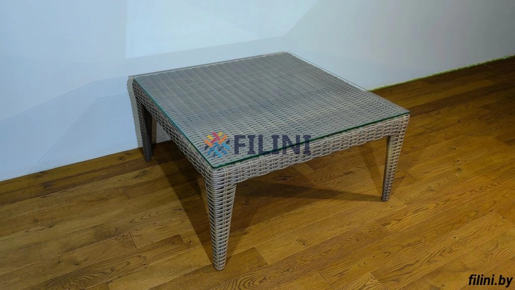 Уличный кофейный столик из искусственного ротанга с накладной столешницей из прозрачного закаленного стекла.