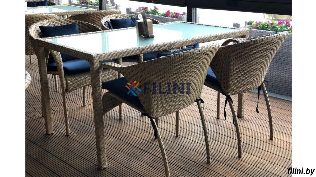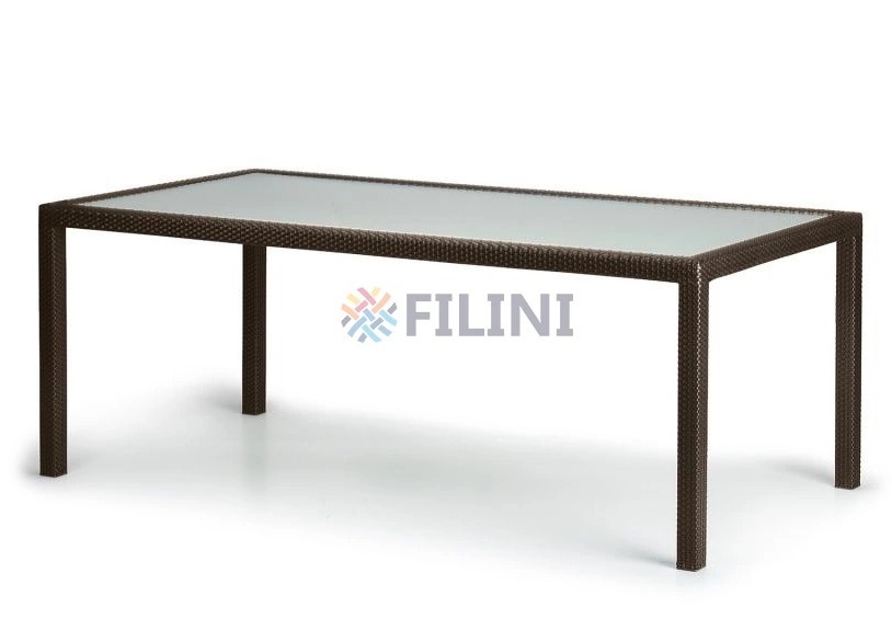 Обеденный уличный стол из искусственного ротанга для уличного кафе, ресторана, дачи или террасы, прямоугольной формы, на металлическом подстолье.