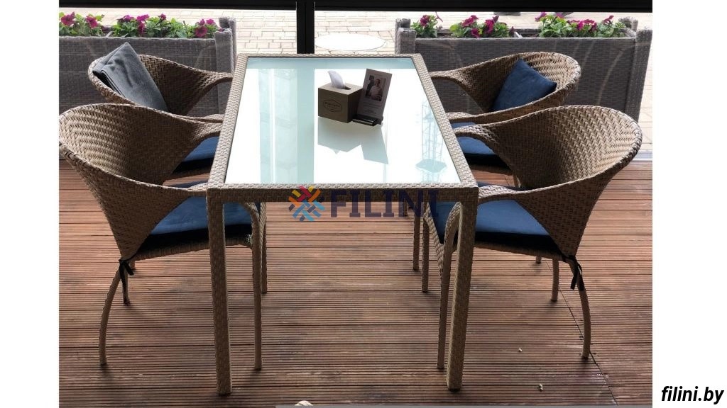 Подстолье изготовлено из профильной трубы 30*30 мм толщиной стенки 1.5 мм, с нанесенным на него защитным полимерным покрытием. Каркас оплетен лентой искусственного ротанга.