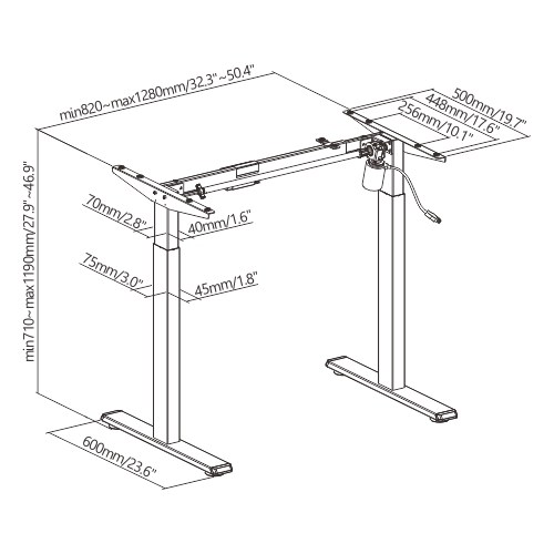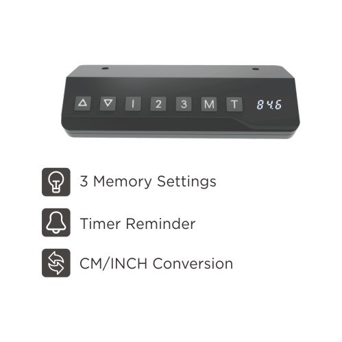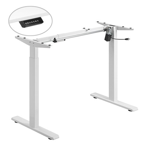 Электро-регулируемый каркас на 2-ух опорах. В каждой опоре два сегмента, что обеспечивает максимальную устойчивость на высоких положениях стола. Пульт аналоговый, на 3 положения запоминания высоты, кнопки вверх-вниз. Помимо этого, стол оснащен таймером, который будет предупреждать о том, что пора сменить положение. По высоте механизм стола регулируется от 73 до 118 см., и раздвигается по длине в диапазоне от 82 см до 128 см. Рама стола выдерживает нагрузку до 80 кг