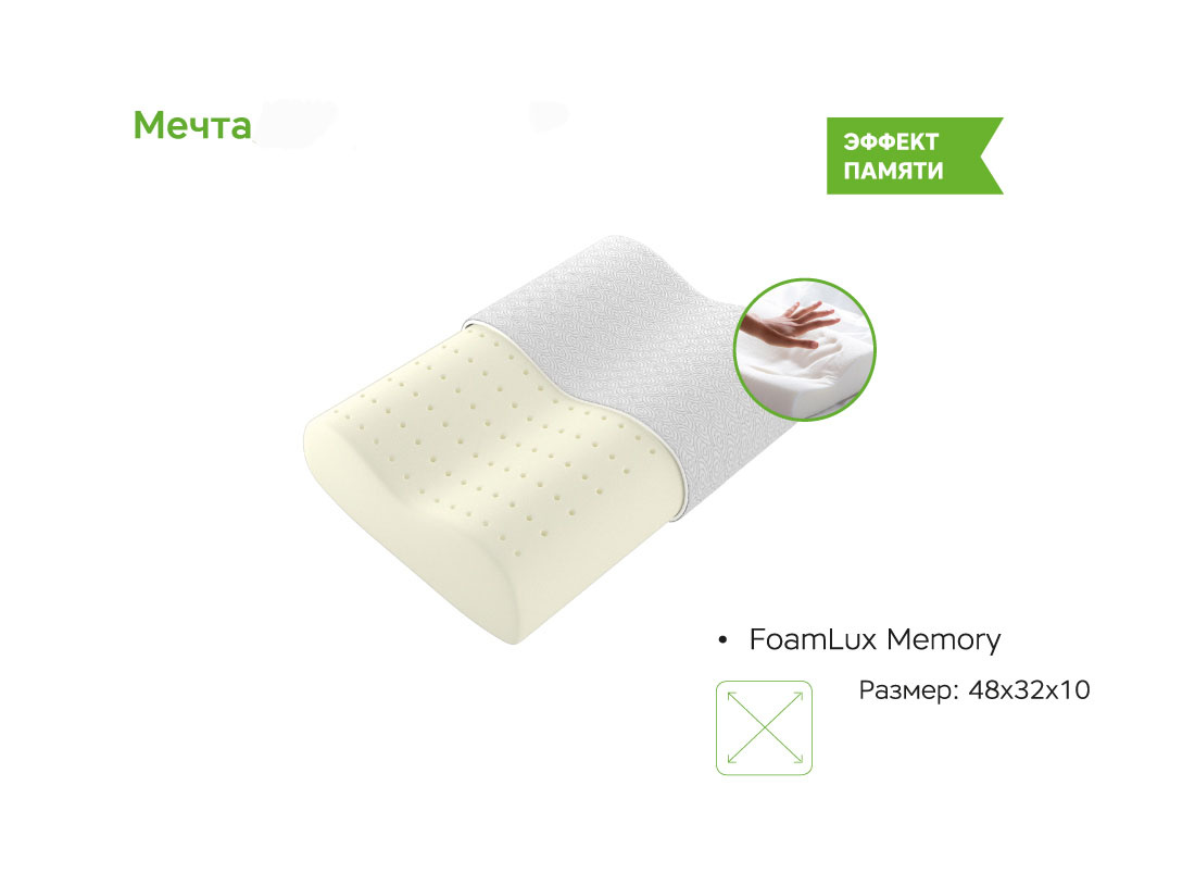 Размер подушки (ШxД): 40х62 см. Материалы: FoamLux Memory (пена с памятью формы).
