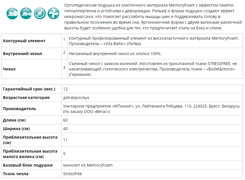 Контурный профилированный элемент из вискоэластичного материала MemoryFoam. Производитель – «Vita Baltic» (Литва).
