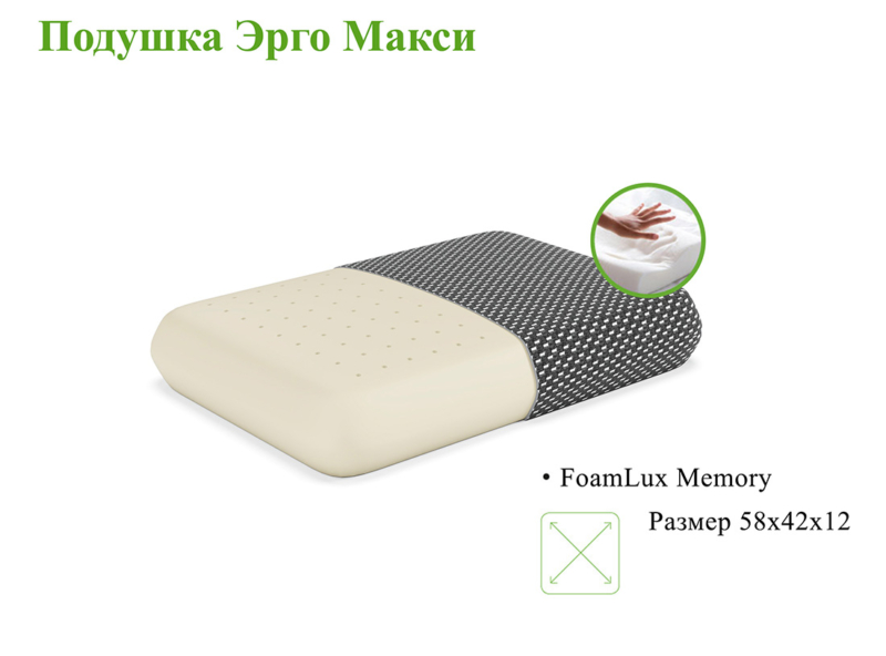 Размер подушки (ШxД): 40x58 см. FoamLux Memory (пена с памятью формы).