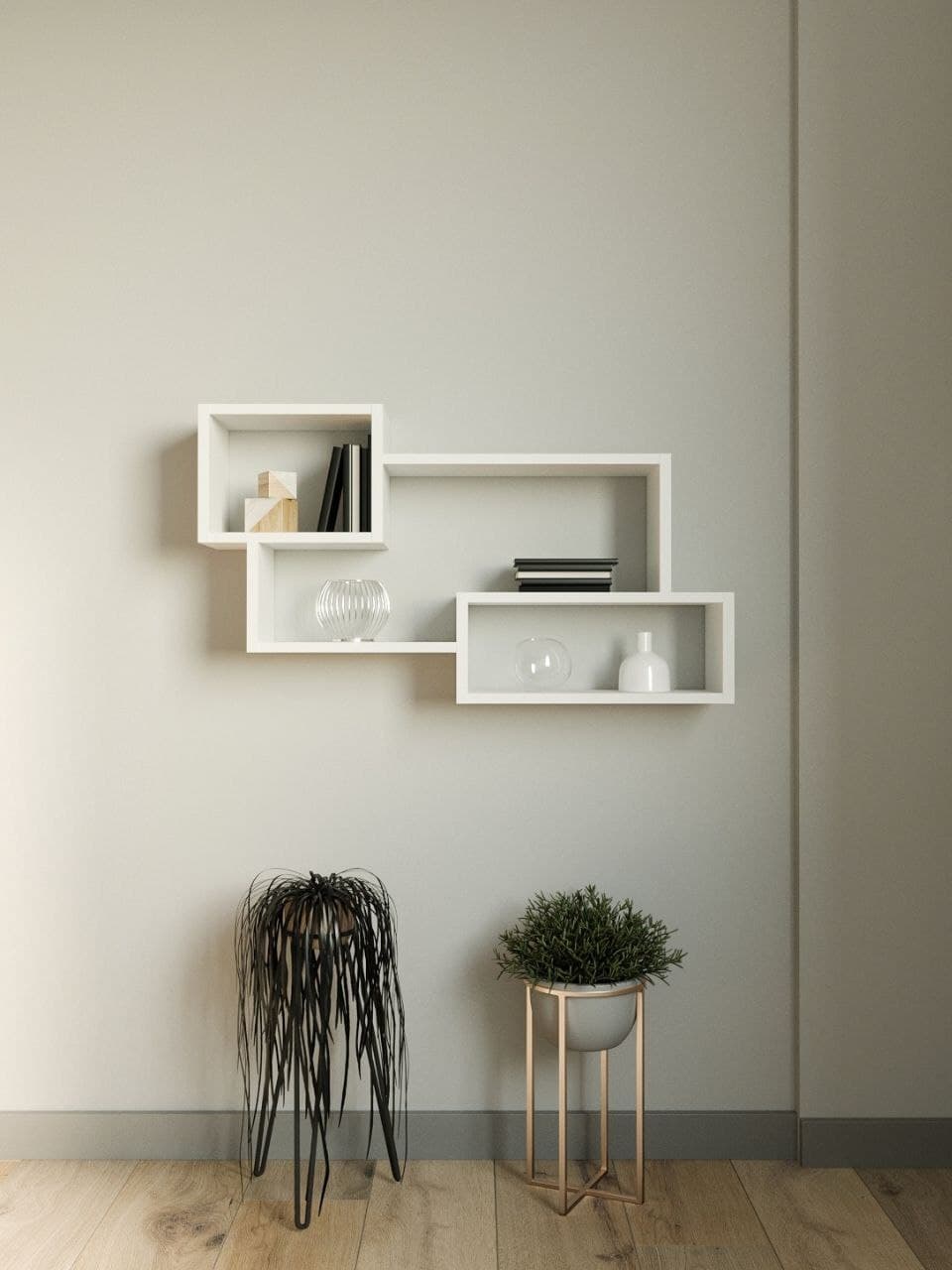 Трехуровневая настенная полка белого цвета. Глубина: 180 мм.