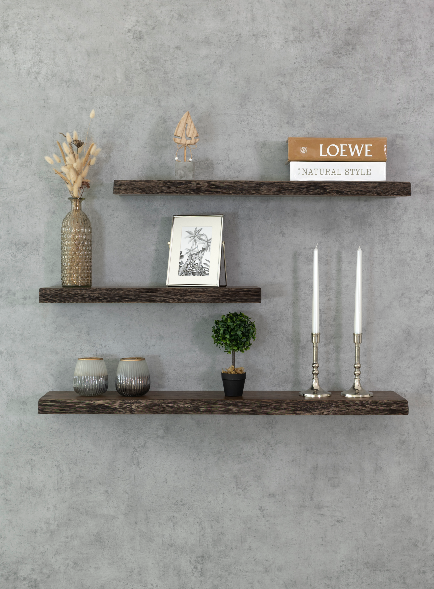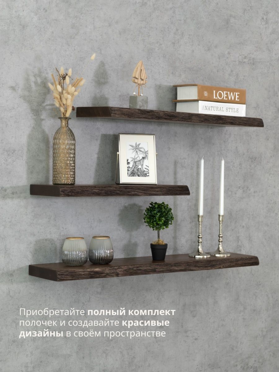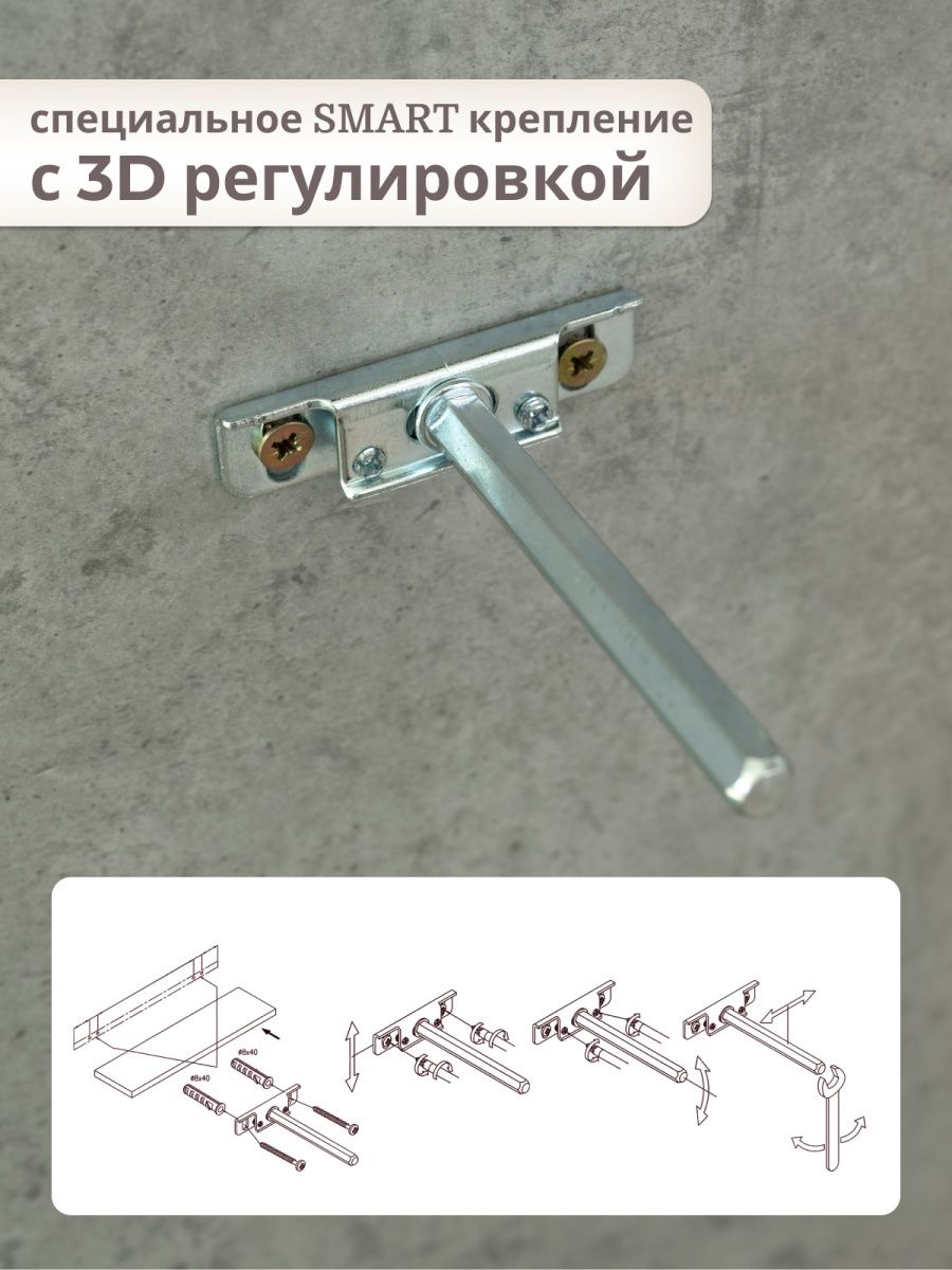 Парящие полки ручной работы выполнены из отборного дуба с индивидуальной текстурой и естественным обзолом. Эффект парения достигается с помощью скрытого SMART крепления с 3D регулировкой.
