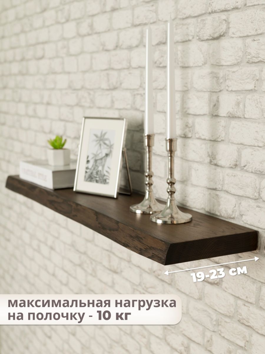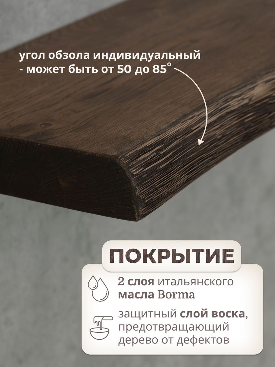 Полка изготовлена из массива дуба толщиной 40 мм, покрыто итальянским маслом и защитным слоем воска, которые предотвращают дерево от дефектов.