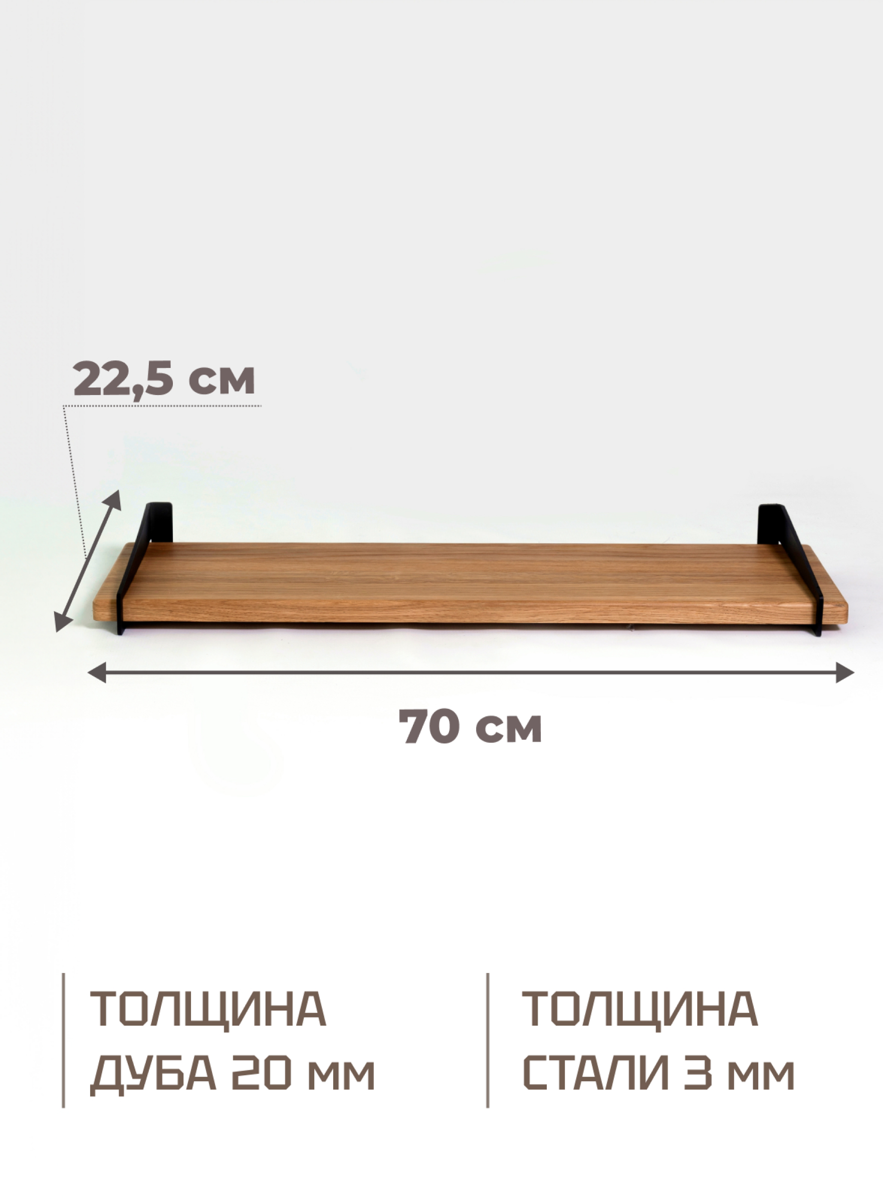 Металлические кронштейны выполнены из высококачественной стали в полимерном покрытии, которое предохраняет изделие от ржавчины. Приятное матовое покрытие — стойкое к воде и царапинам. Полка изготовлена из массива дуба толщиной 20 мм, покрыто итальянским маслом и защитным слоем воска, которые предотвращают дерево от дефектов.