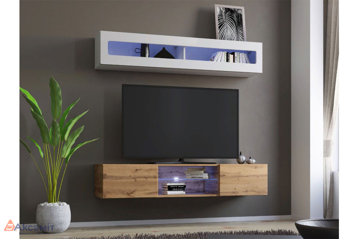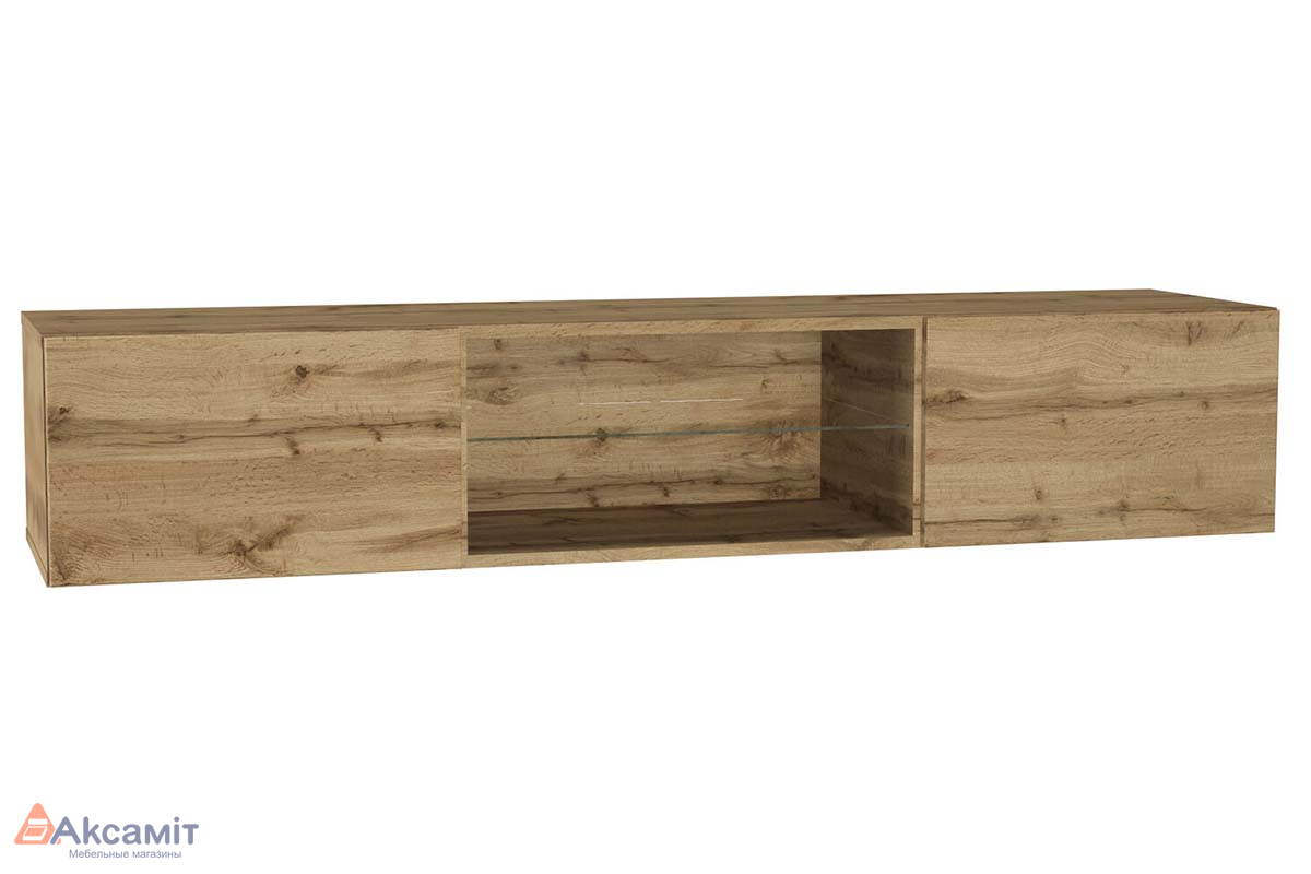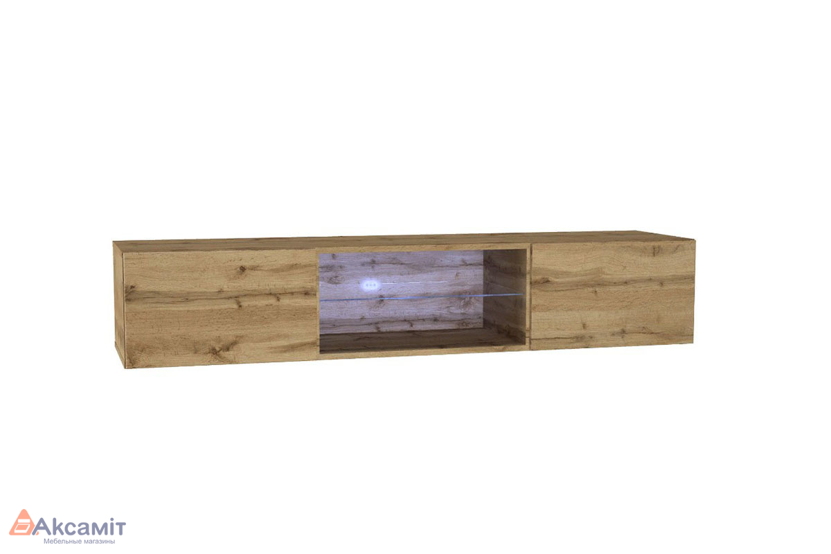 ТВ-тумба с подсветкой Поинт за счет скрытого крепления и отсутствия внешней фурнитуры выглядит так, словно парит в воздухе. Модель отлично подходит для установки монитора большой диагонали и размещения сопутствующей аппаратуры. В центре расположена открытая стеклополка.