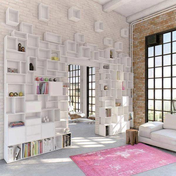 Дизайнерская стенка белого цвета оборудована большим количеством отсеков различного формата.