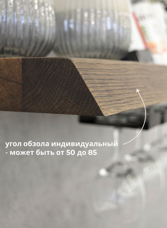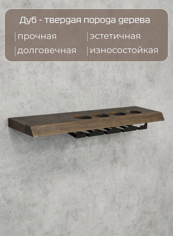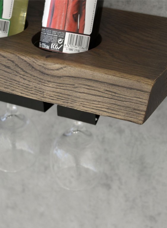 Полка изготовлена из цельноламельного массива дуба, покрытого двумя слоями итальянского масла Borma и специальным воском, держатель для бокалов выполнен из высококачественной стали в полимерном покрытии. Толщина металла бокальницы — 1 мм.