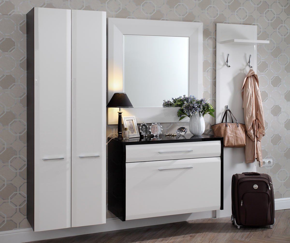 Стенка с вешалками, штангой для шарфов и полкой для головных уборов; подвесная тумба с зеркалом.