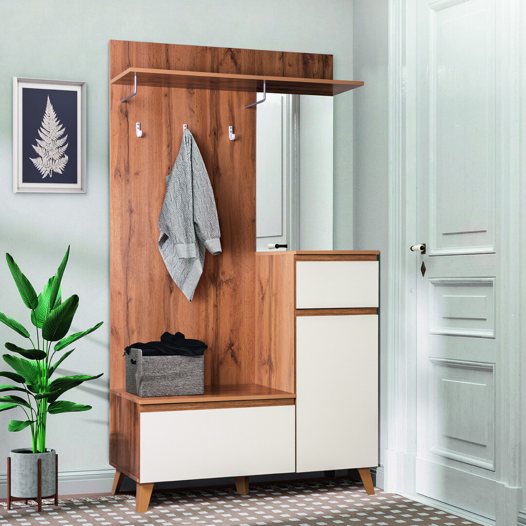 Тумба обувная из ЛДСП с ящиком и нишей для зонтов и сумок, настенное зеркало.