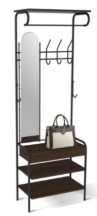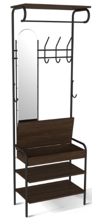 Функциональная компактная прихожая из металлической трубы 20х0,8 мм. Полки из ламинированного ДСП толщиной 16,5мм. Снизу расположены две полки для обуви и домашних тапочек. Сверху ящик с откидной дверцей для обувных принадлежностей. Размер ящика ШхГхВ: 600х320х60 мм. Размеры зеркала ШхВ: 200х1090 мм. Расстояние от пола до нижней полки 11,5 см. Максимальная нагрузка на полку 10 кг. Сверху предусмотрена полка для головных уборов и крючки для одежды.