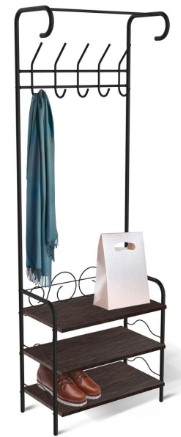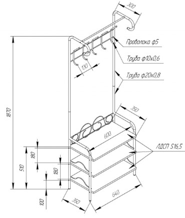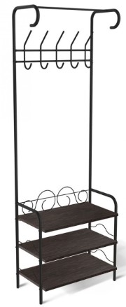 Небольшая прихожая шириной 64 см подойдет для маленького помещения в городской квартире. Компактные размеры и классический дизайн. Цвет прихожей черный металл в сочетании с полками из ЛДСП в цвете венге. В прихожей имеются крючки для верхней одеждв, сумок и зонтов, а также полочки для уличной и домашней обуви.