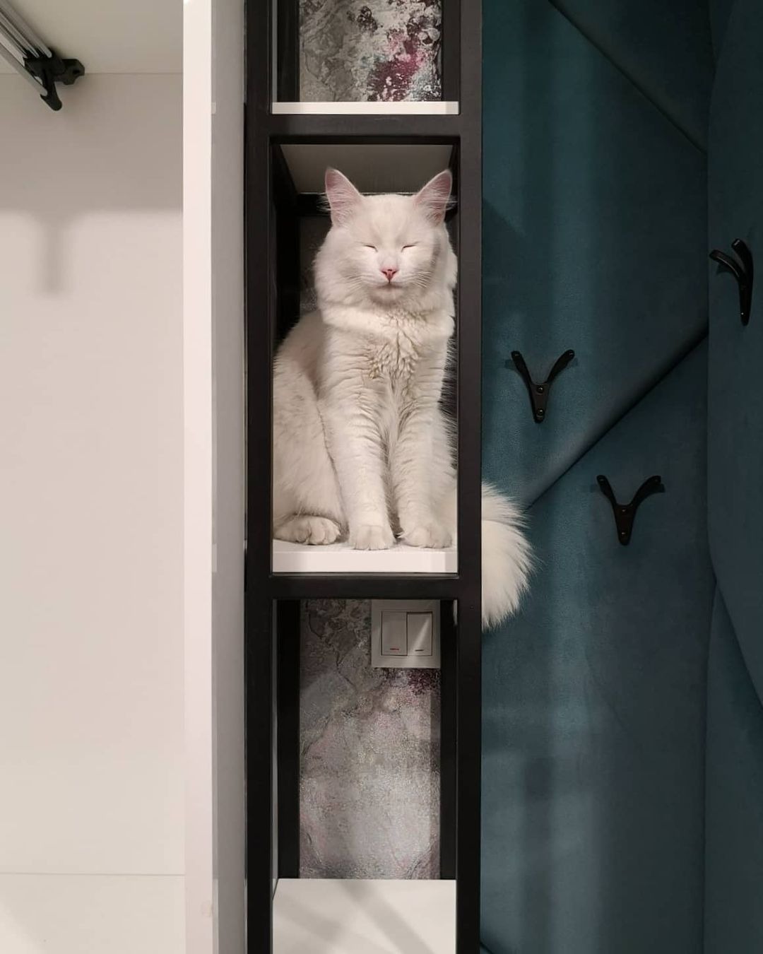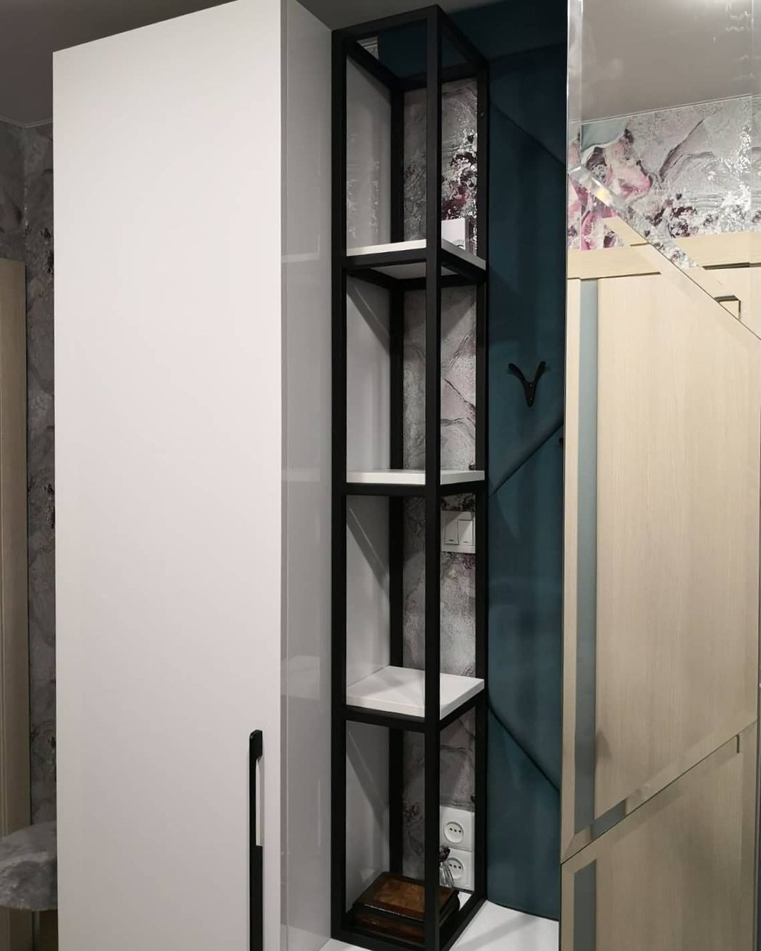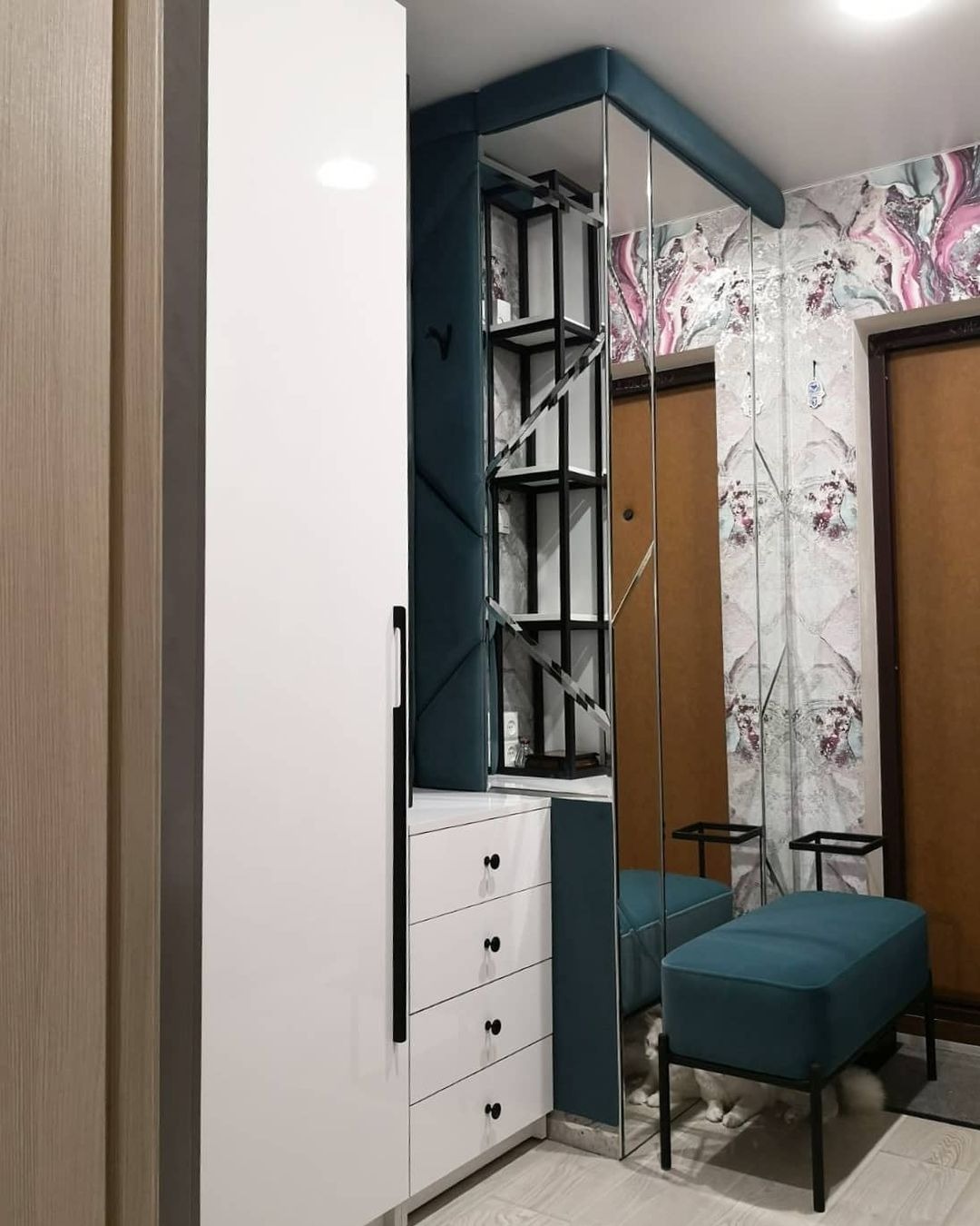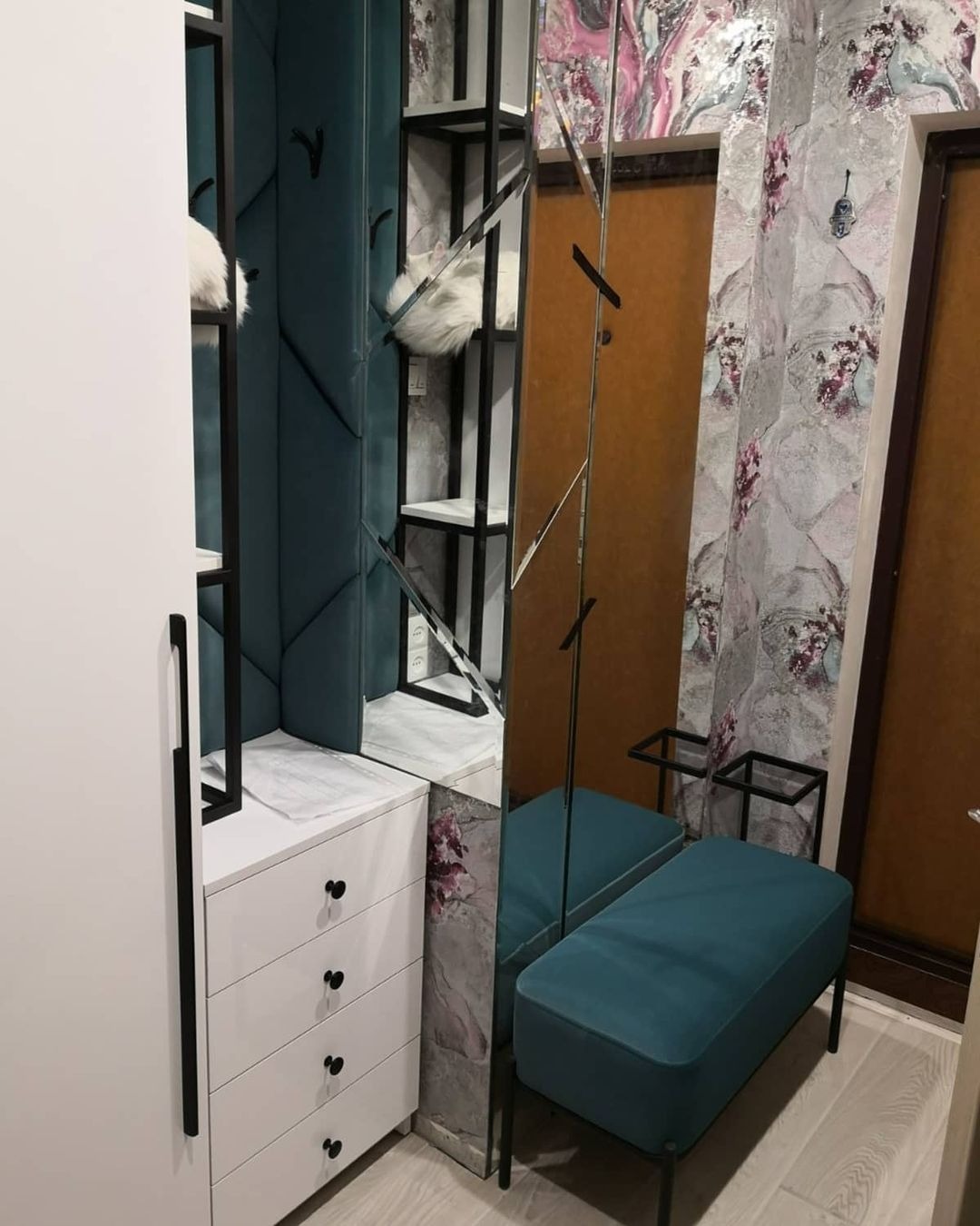 Прихожая с вешалкой, шкафом, комодом, тумбой и зеркалом.