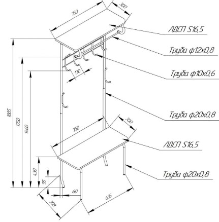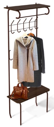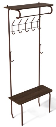 Компактную прихожую необходимо крепить к стенке на специальные крючки. Каркас прихожей изготовлен из металлической трубы покрытой специальным порошковым покрытием. Цвет коричневый муар. Полки из ламинированной плиты дсп. На нижнюю полку садиться нельза. Верхняя полка используется под головные уборы. В комплекте множество крючкой для одежды, зонтов и сумок.