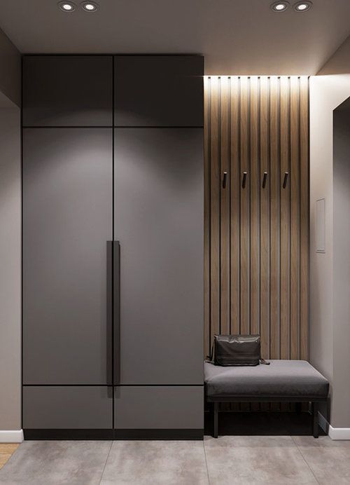 Двухстворчатый шкаф с серыми матовыми фасадами комплектуется длинными ручками. Для размещения верхней одежды предназначены крючки, закрепленные на вертикальных настенных планках с древесным покрытием.